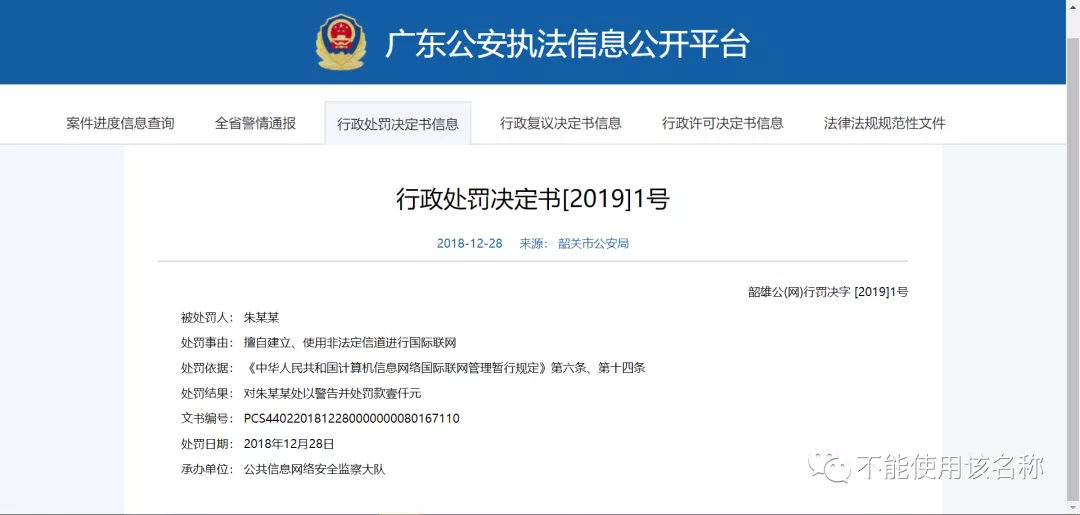 2018 年 12 月 28 日,广东韶关南雄市公安局对“翻墙”的朱某某作出行政处罚决定,理由为“擅自建立、使用非法定信道进行国际联网”,处以 1000 元人民币罚款,其处罚依据为《中华人民共和国计算机信息网络国际联网管理暂行规定》第六条、第十四条