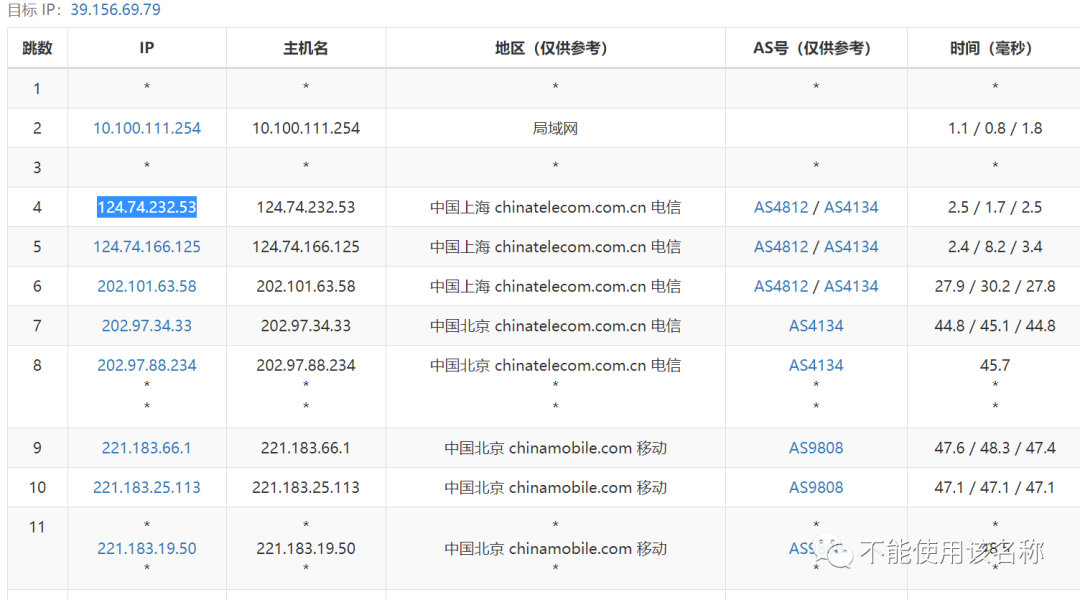 使用 traceroute(链接:https://tools.ipip.net/traceroute.php ),可以利用 ICMP 协议定位您的计算机和目标计算机之间的所有路由器节点。下图展示了我从自己的计算机访问百度设在北京的服务器 39.156.69.79 所经过的骨干网和路由节点,可以看见其经过了 AS4812(中国电信 163 骨干网)的 124.74.232.53、124.74.166.125 等路由节点,而其途径的 AS9808 为中国移动骨干网的 AS 自治系统