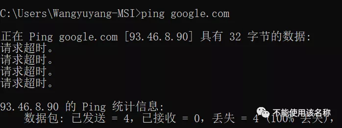 直接使用 windows 的 ping 命令就可以亲眼看到 DNS 污染的运作效果。谷歌官网的服务器明明架设在美国科罗拉多丹佛,但从下图可以看见,在国内从 DNS 服务器请求到的 ip 地址却是 93.46.8.90 这个来自意大利的无效 IP 地址