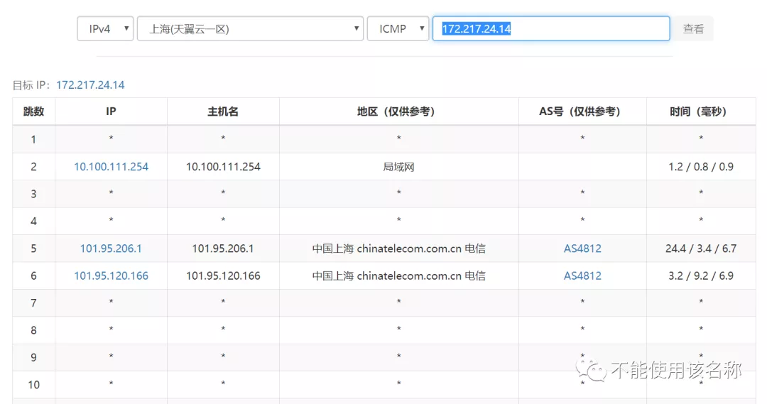 可以看见,当数据包跳转给中国电信上海 AS4812 群组的 101.95.120.166 路由节点之后,就再也跟踪不到数据包的踪迹了。这是因为在这一节点,存在着一个无效的路由黑洞,其声称自己拥有 172.217.24.12 这一 ip 地址的访问可达性,但话音刚落,它就把数据包丢弃在角落了……